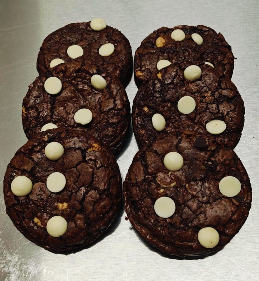 Brownie koeken met een zachte kern. Gevuld met pure en witte chocolade