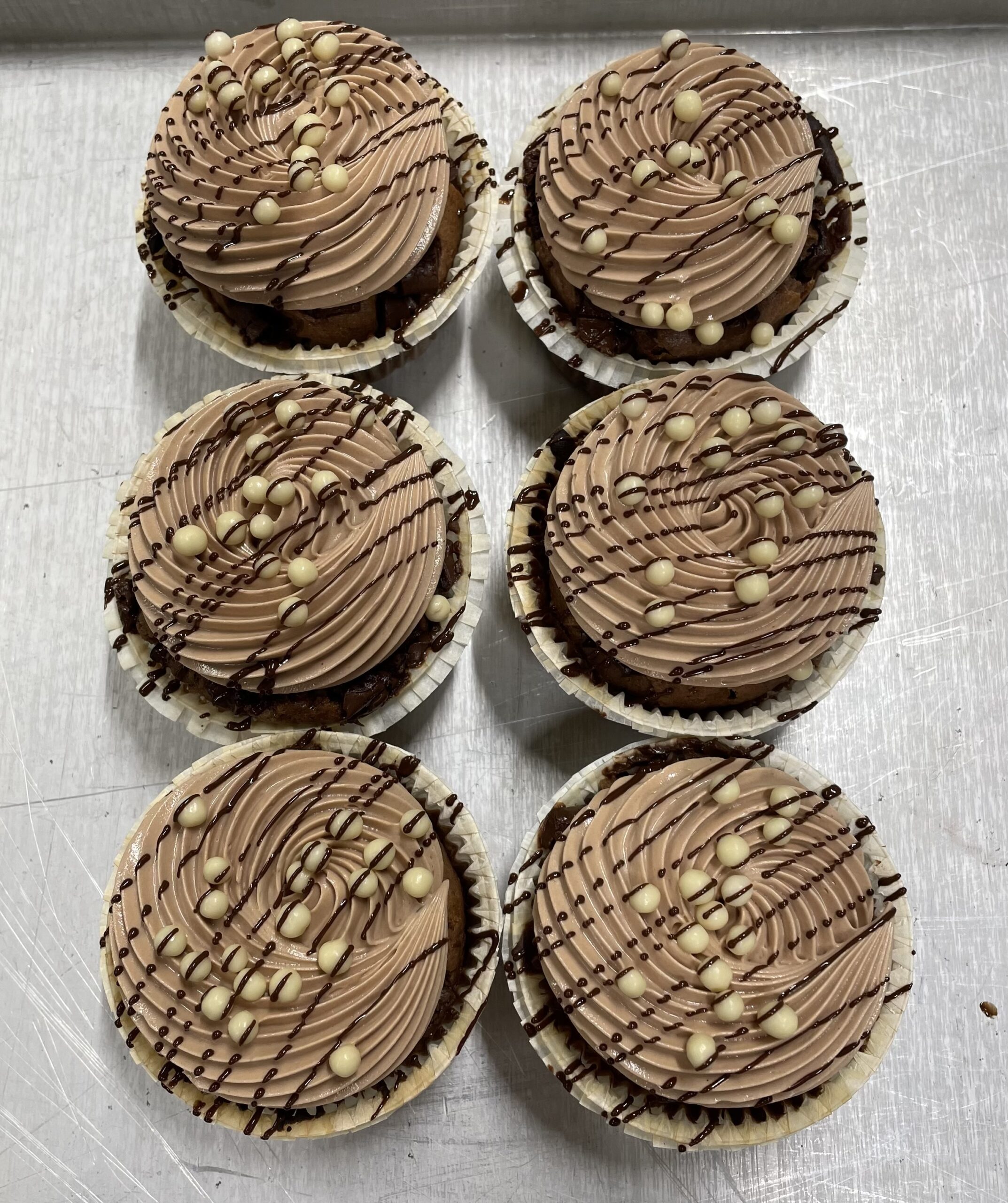 Chocolade muffins met stukjes pure chocolade, afgemaakt met luchtige chocolade crème