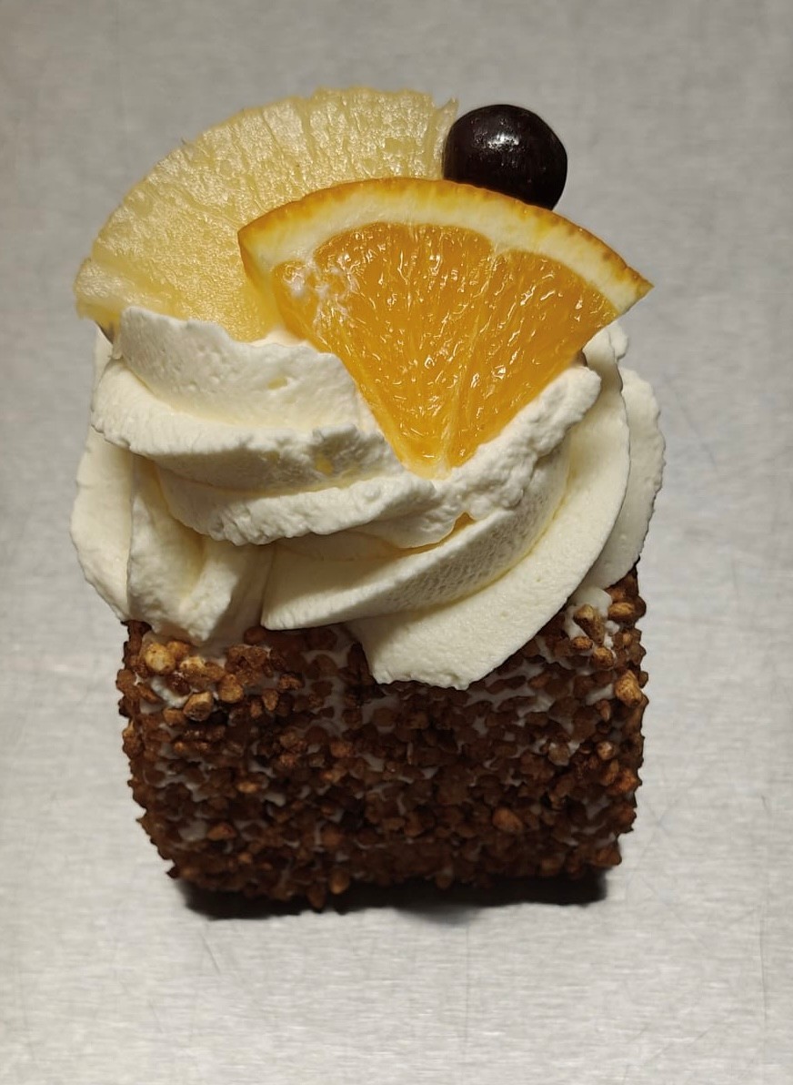 Slagroom gebak Luchtige cake gevuld met banketbakkersroom en bosvruchten jam. Aangezet met krokante hazelnoot