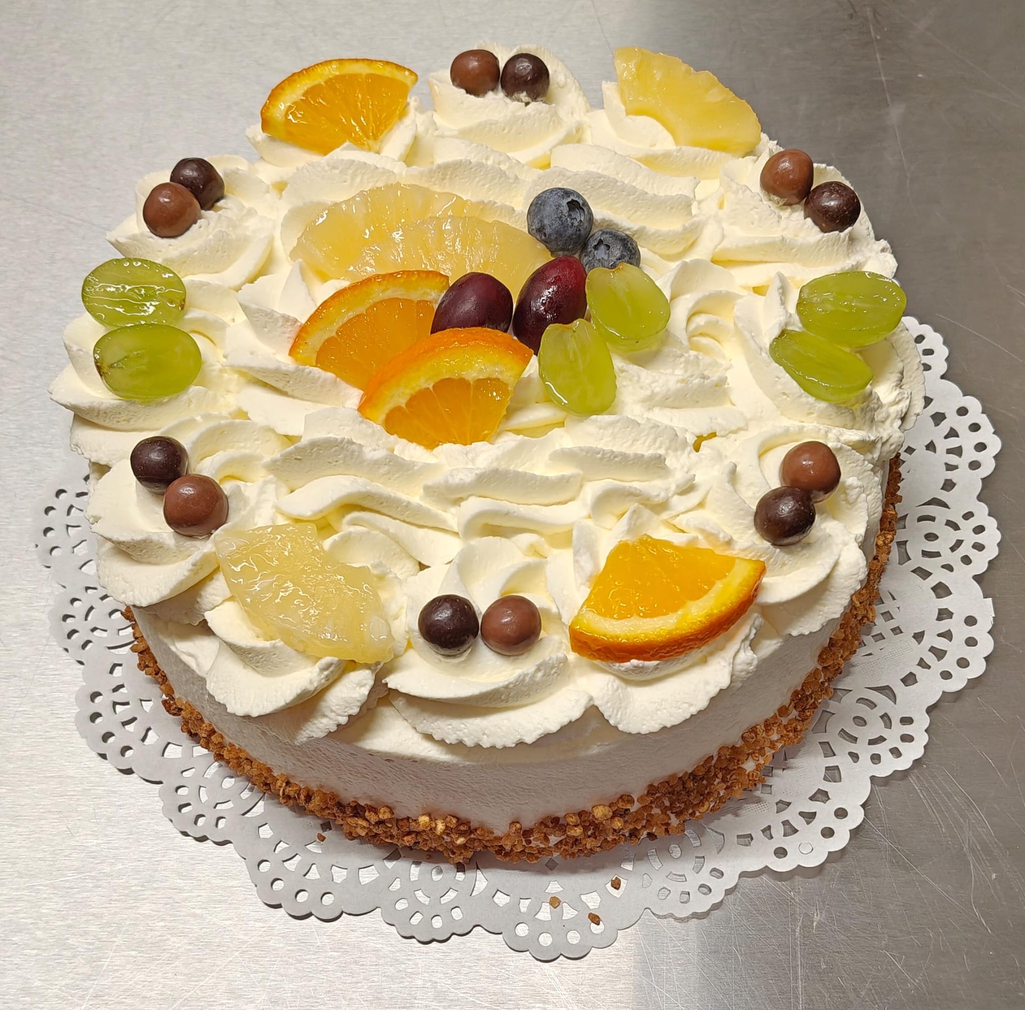 Aangezet met krokante hazelnoot en gedecoreerd met vers fruit.